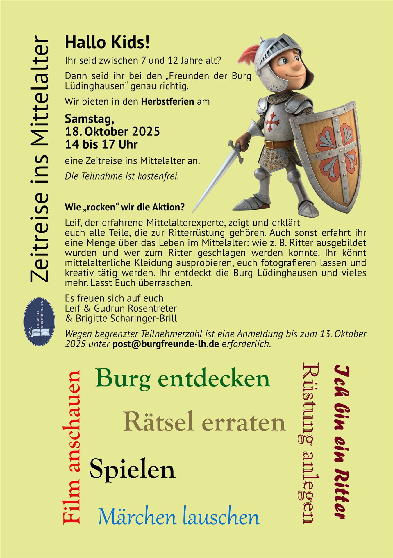 Leif, der erfahrene Mittelalterexperte, zeigt und erklärt euch alle Teile, die zur Ritterrüstung gehören. Auch sonst erfahrt ihr eine Menge über das Leben im Mittelalter: wie z. B. Ritter ausgebildet wurden und wer zum Ritter geschlagen werden konnte. Ihr könnt mittelalterliche Kleidung ausprobieren, euch fotografieren lassen und kreativ tätig werden. Ihr entdeckt die Burg Lüdinghausen und vieles mehr. Lasst Euch überraschen.