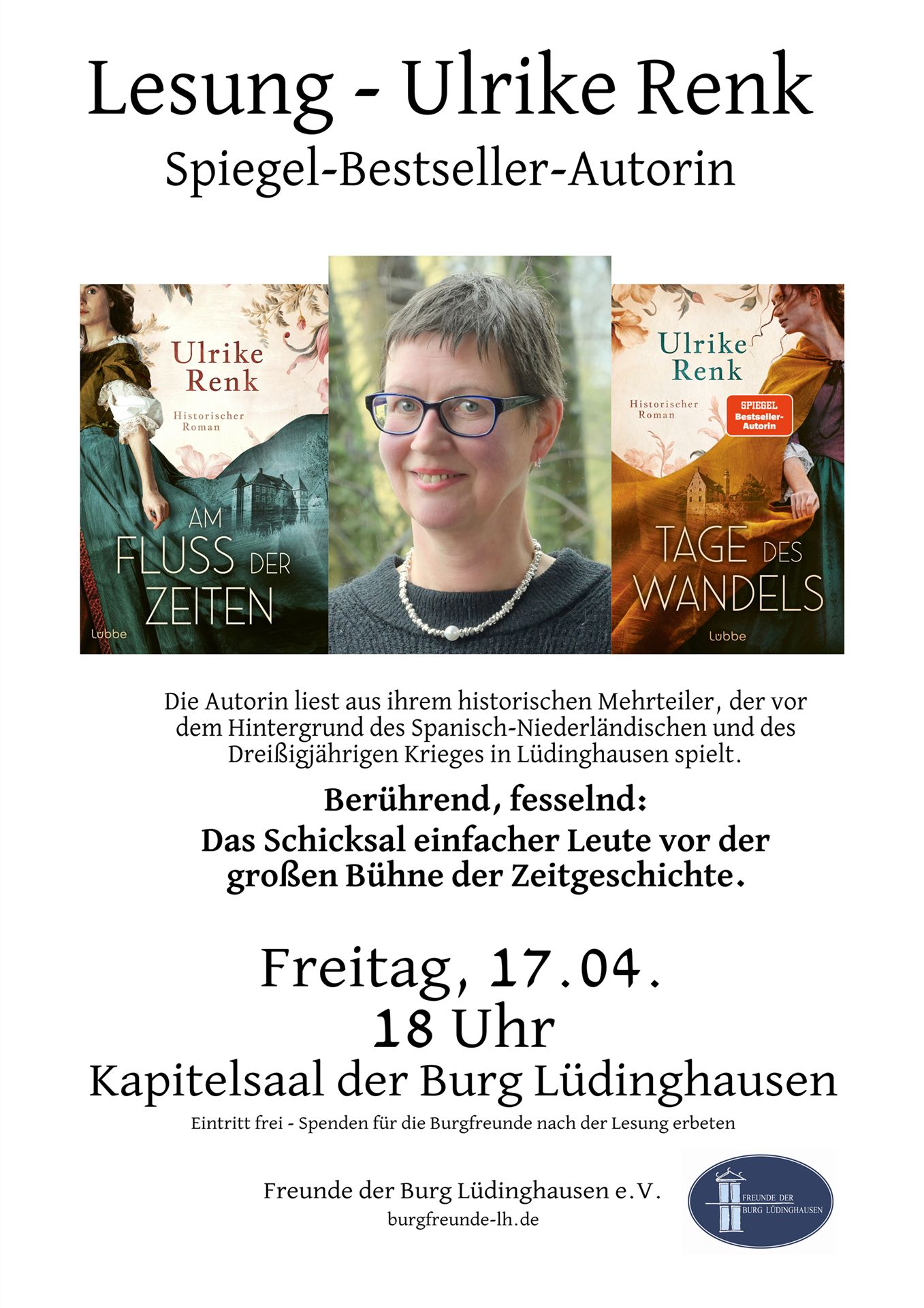 Die Bestsellerautorin Ulrike Renk liest aus ihren Werken. Im Mittelpunkt steht das Leben der einfachen unfreien Menschen im Münsterland des 16. und 17. Jahrhunderts. Schwerpunkt ist die Burg Kakesbeck und Lüdinghausen selbst.